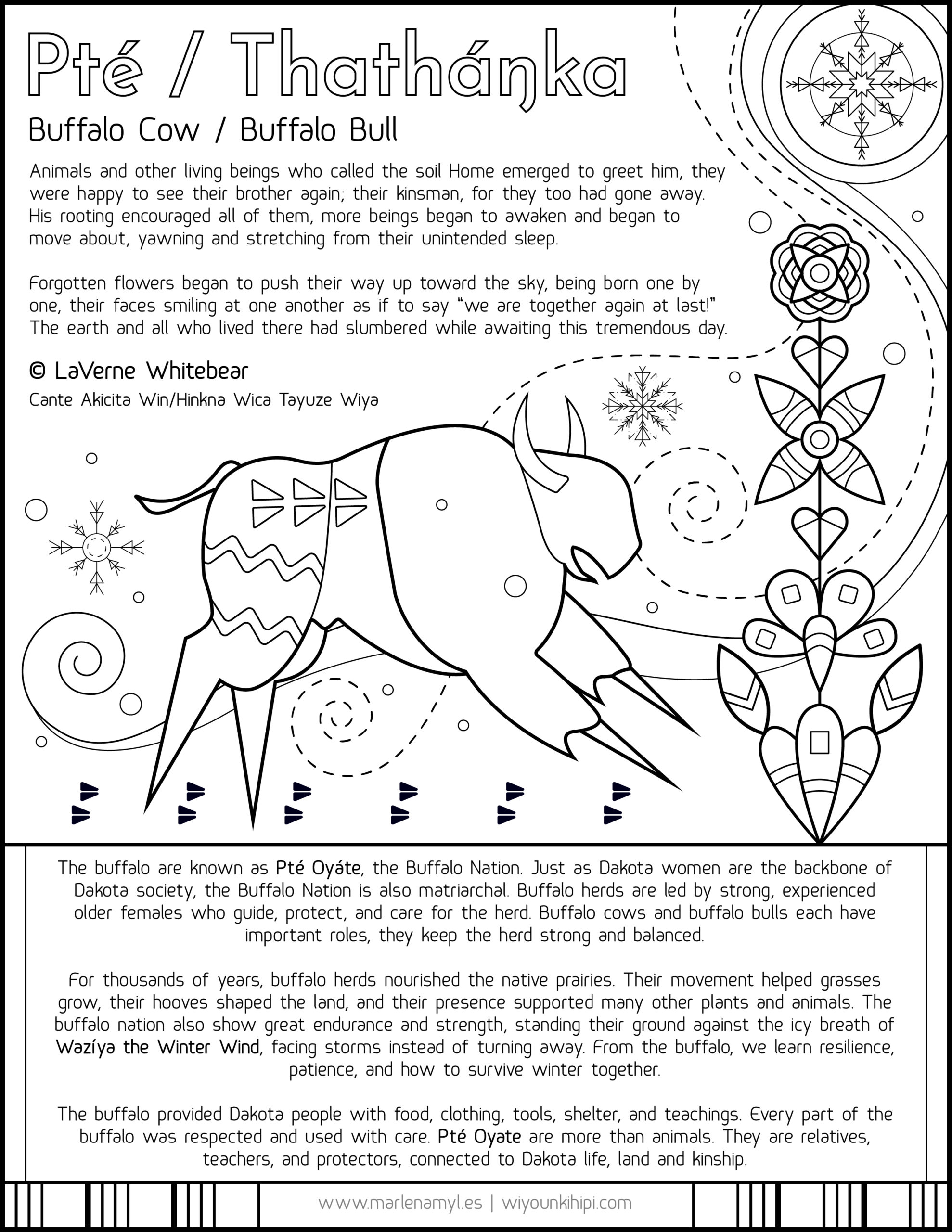 The buffalo are known as Pté Oyáte, the Buffalo Nation. Just as Dakota women are the backbone of Dakota society, the Buffalo Nation is also matriarchal. Buffalo herds are led by strong, experienced older females who guide, protect, and care for the herd. Buffalo cows and buffalo bulls each have important roles, they keep the herd strong and balanced.