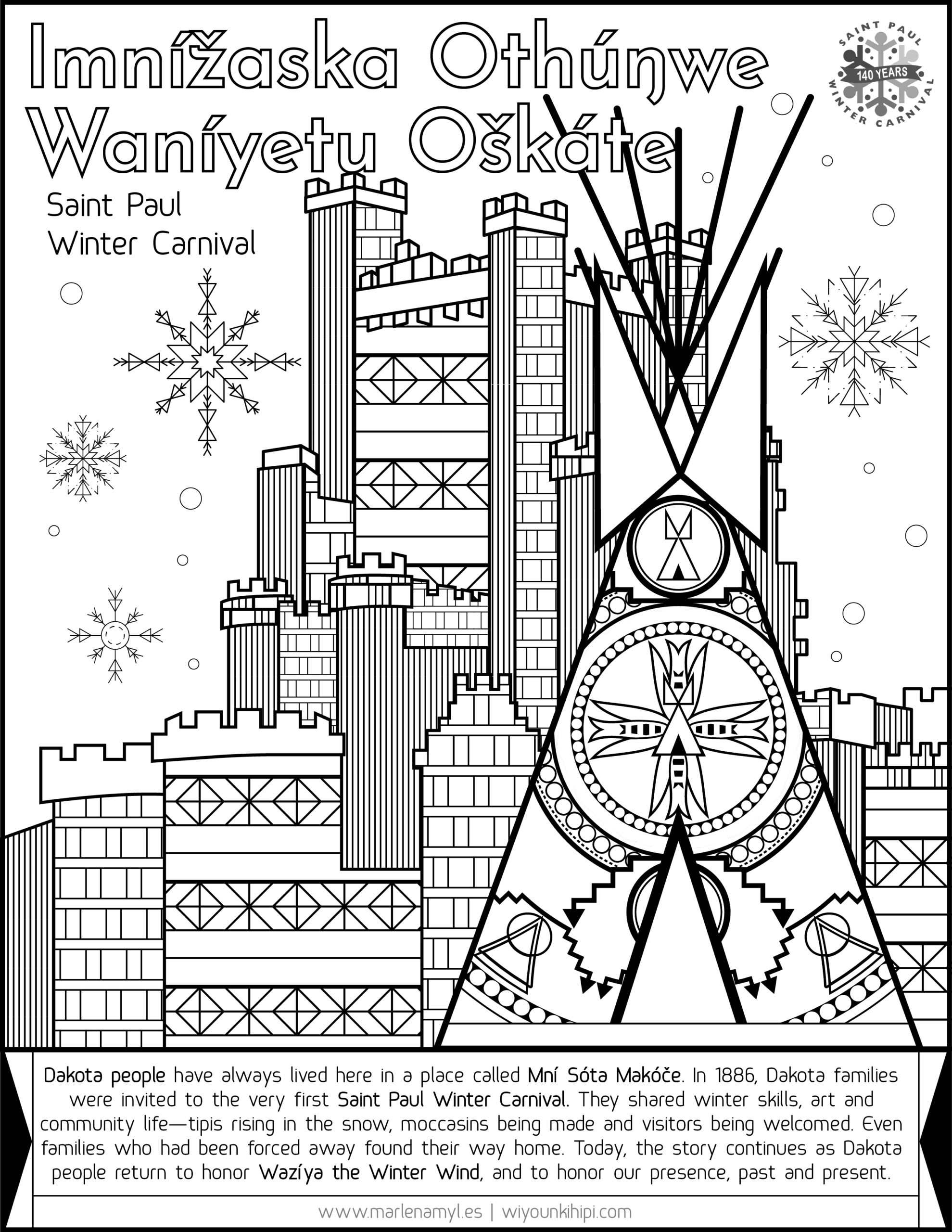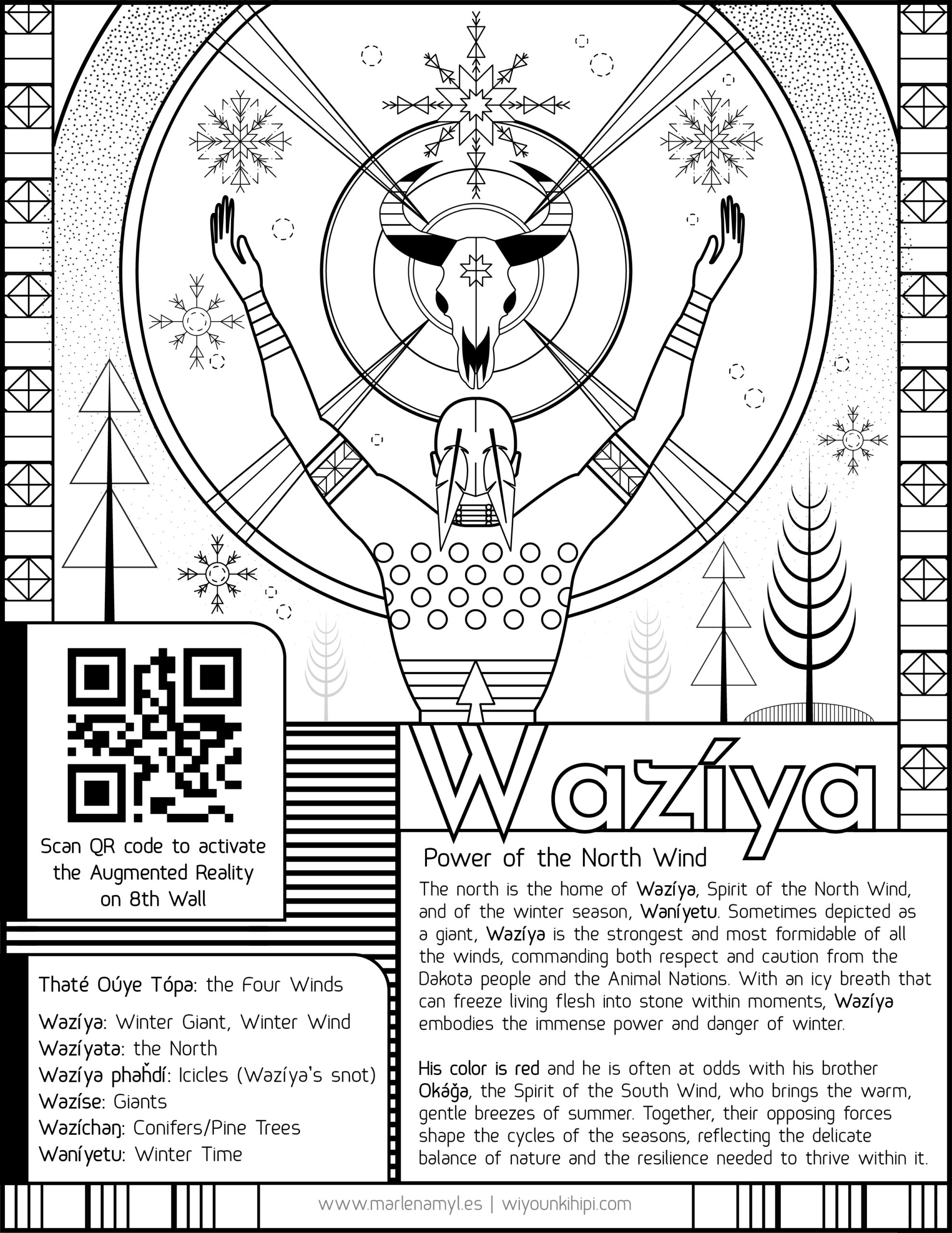 These coloring pages were created by Spirit Lake Dakota artist Marlena Myles to celebrate winter! You are free to download for personal/classroom/educational events use only. These come with an augmented reality component that you can activate anyplace to visit with Waziya, the Dakota Spirit of the North Wind!